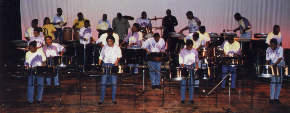 One of my favourite hobbies - steel pan! and how can it not be. I spend most of my time w/ these guys... but hey, they're the coolest to be around. Want ViBeS in bulk!?! Need I say more?? This is a full stage view of the band at our concert in 98. WARNING: This is your 1st peak at the 'Bashment Basses' located stage right at far back! Watching them in live action may invoke feelings of 'movement' and 'jive' in the body. In severe cases, victims have been known to display strange dance actions, and unexpected outbursts of laughter! Approach w/ extreme caution! | |||||||||||||||||||||||||